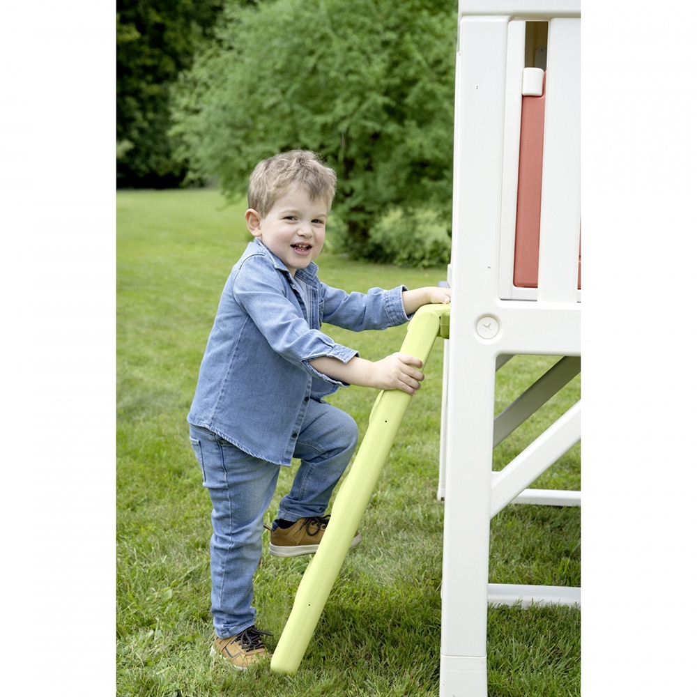 - Casuta Smoby dispune de scari antiderapante, iar copii se vor putea bucura de o frumoasa priveliste a gradinii de la ferestre sau terasa din fata usii de intrare