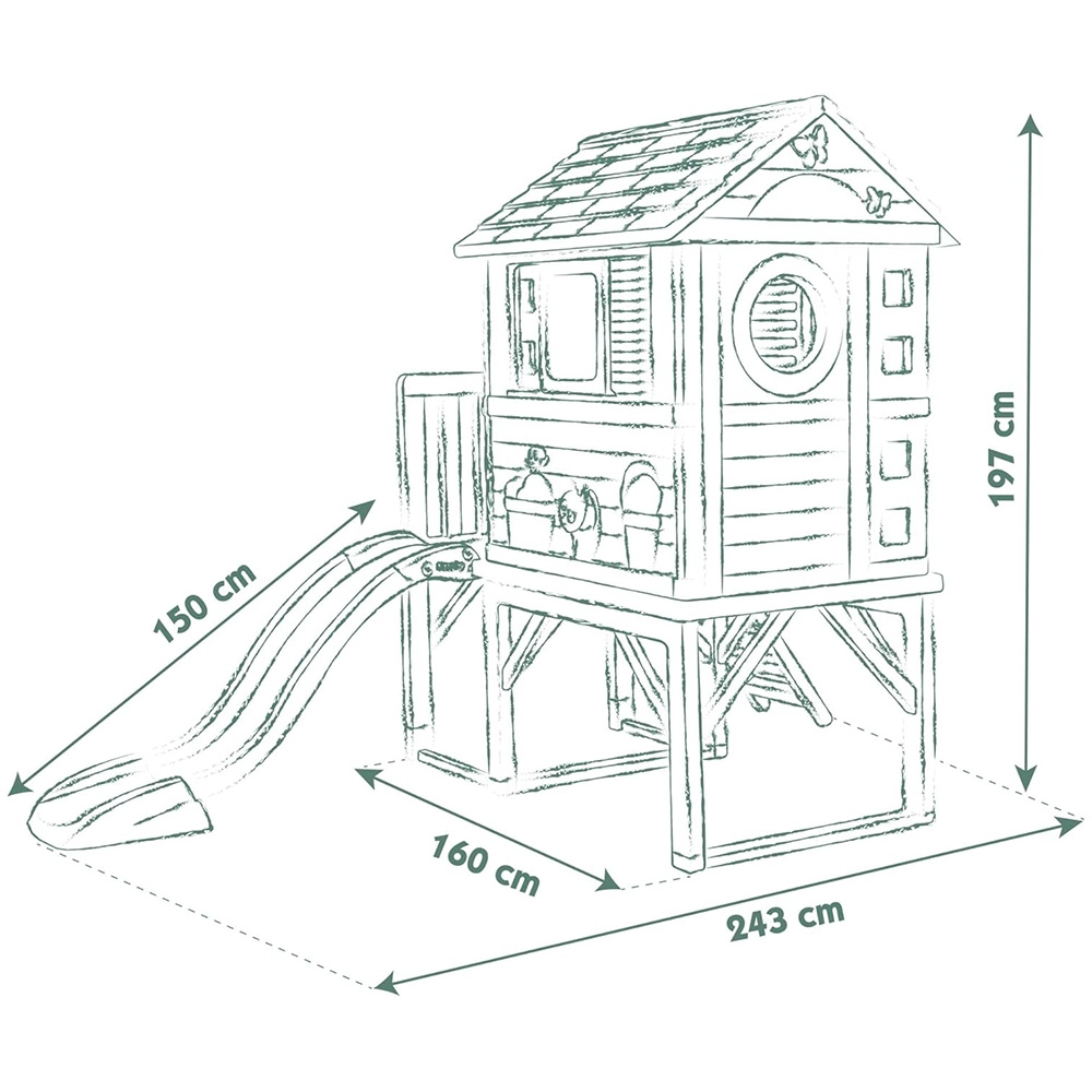 - Aceasta casuta originala se afla pe piloni de inaltimea de 70 cm, datorita carora copii pot avea parte si de un tobogan mare, cu o lungime de 1,5 m