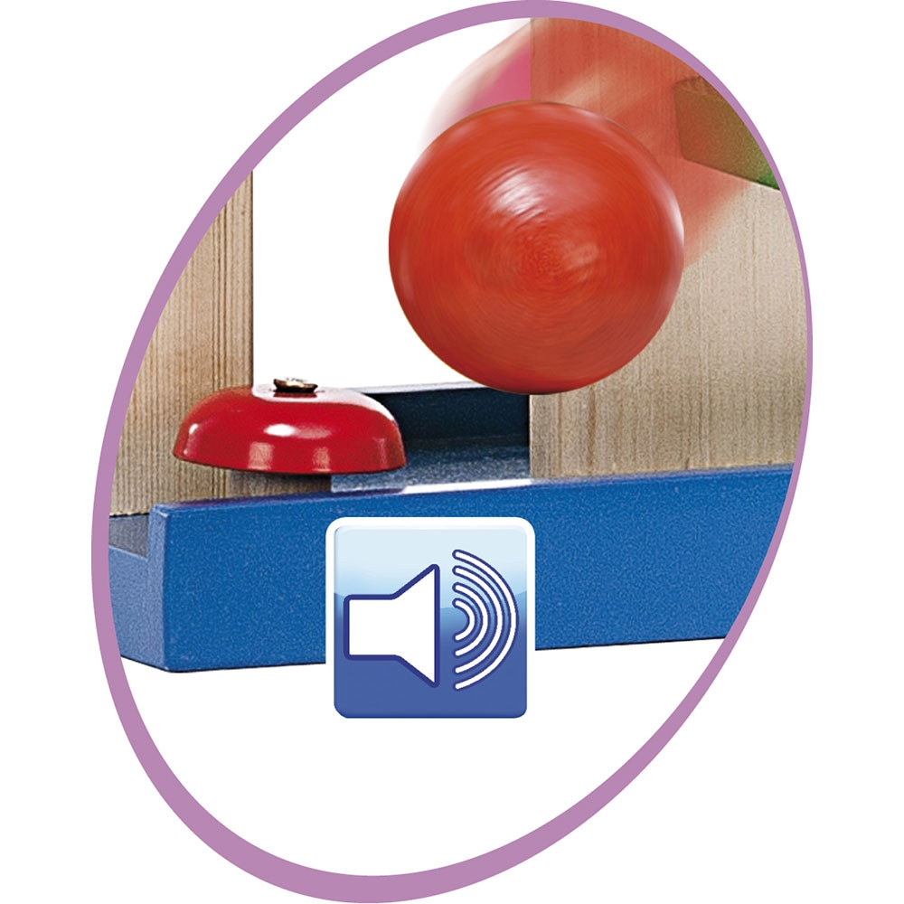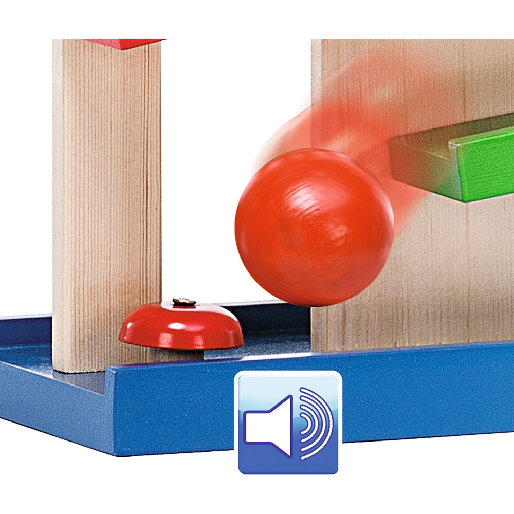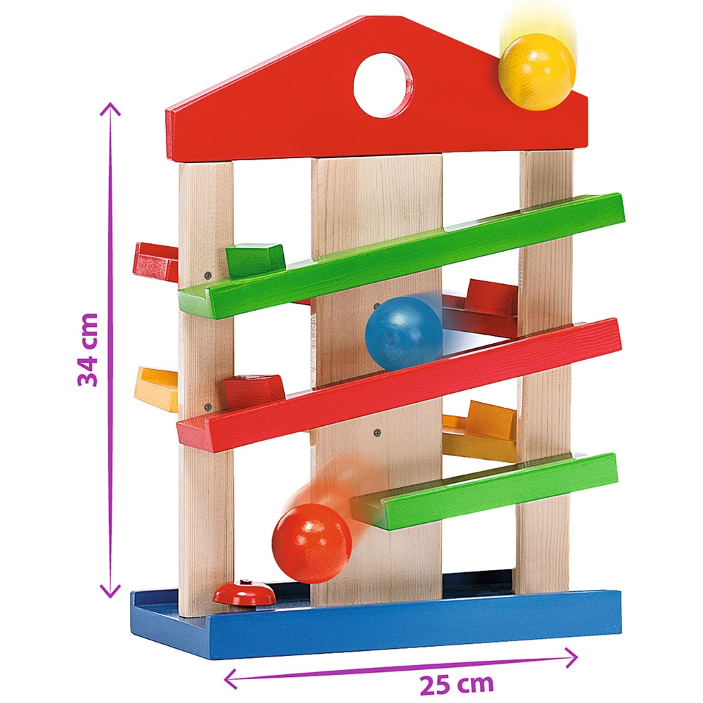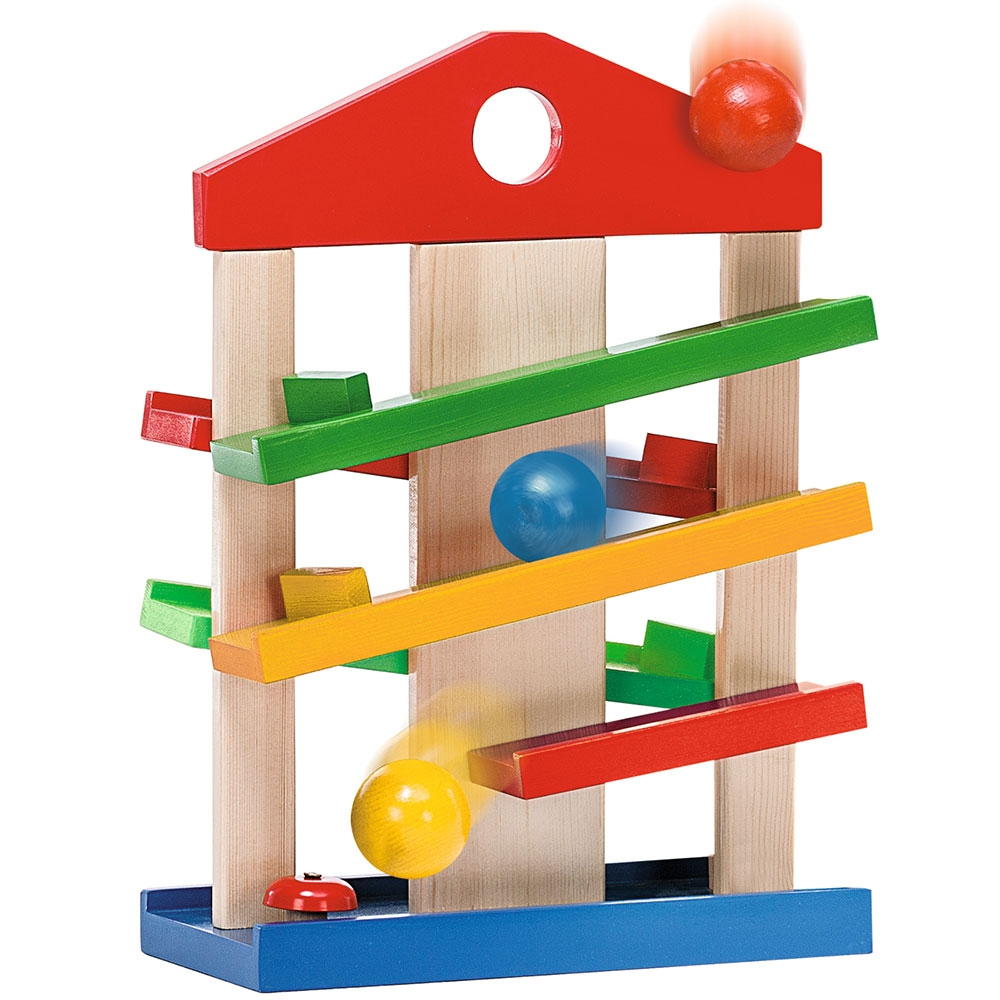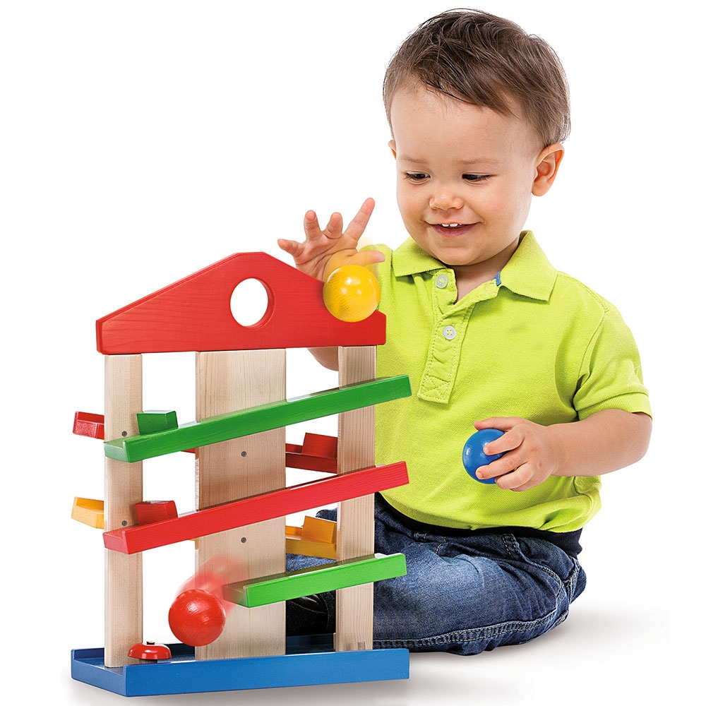 • Bilele se pozitioneaza in partea de sus si se rostogolesc pana jos, urmand traseul. Astfel, micutii vor fi atrasi de aceasta jucarie cu bile, modalitatea in care bila va ajunge de pe o pista pe alta le va capta atentia