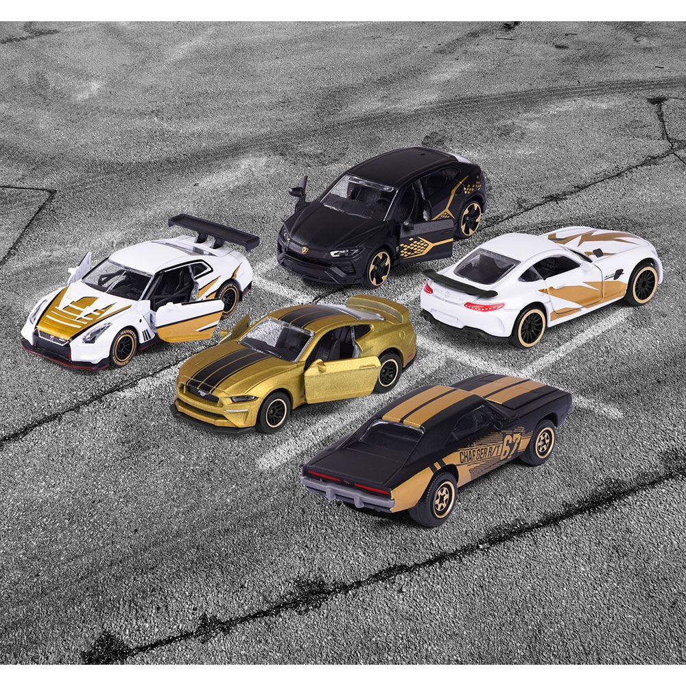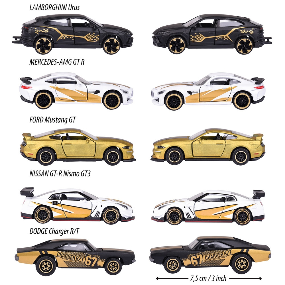Setul contine urmatoarele modele cu design realist: Dodge Charger R/T, Ford Mustang GT si Lamborghini Urus, precum si 2 modele exclusive care se gasesc doar in acest set - Mercedes-AMG GT R and the Nissan GT-R Nismo GT3