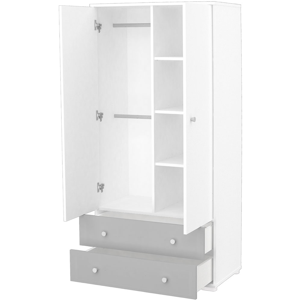 - Dulapul a fost proiectat sa fie usor de aranjat si practic de folosit. in spatele celor doua usi se gasesc rafturi si carlige pentru umerase, iar jos se afla doua sertare care ajuta la organizarea lucrurilor