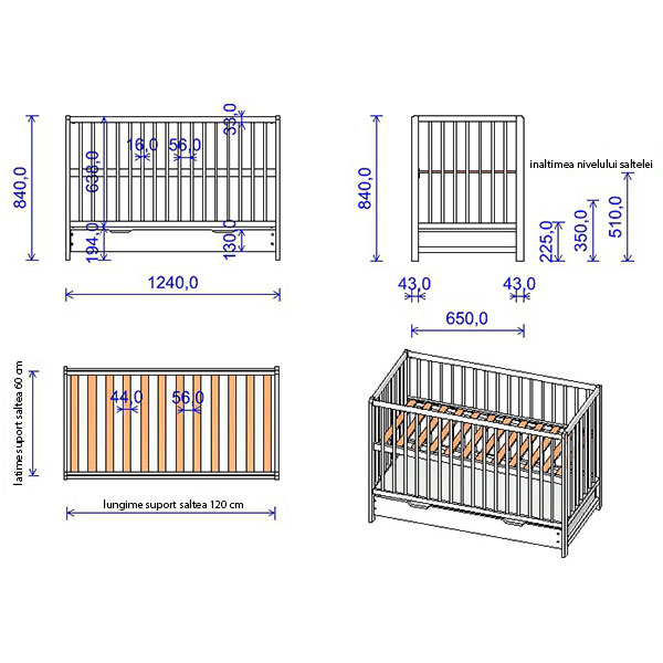 • Este realizat din lemn masiv si semifabricate din lemn (PAL), beneficiaza de finisaje de exceptie, partile patutului sunt tratate cu vopsele si lacuri ecologice pe baza de apa conform normelor si reglementarilor Europene, somiera nu este tratata cu vopsea, nu reprezinta nici un pericol pentru sanatatea celui mic.