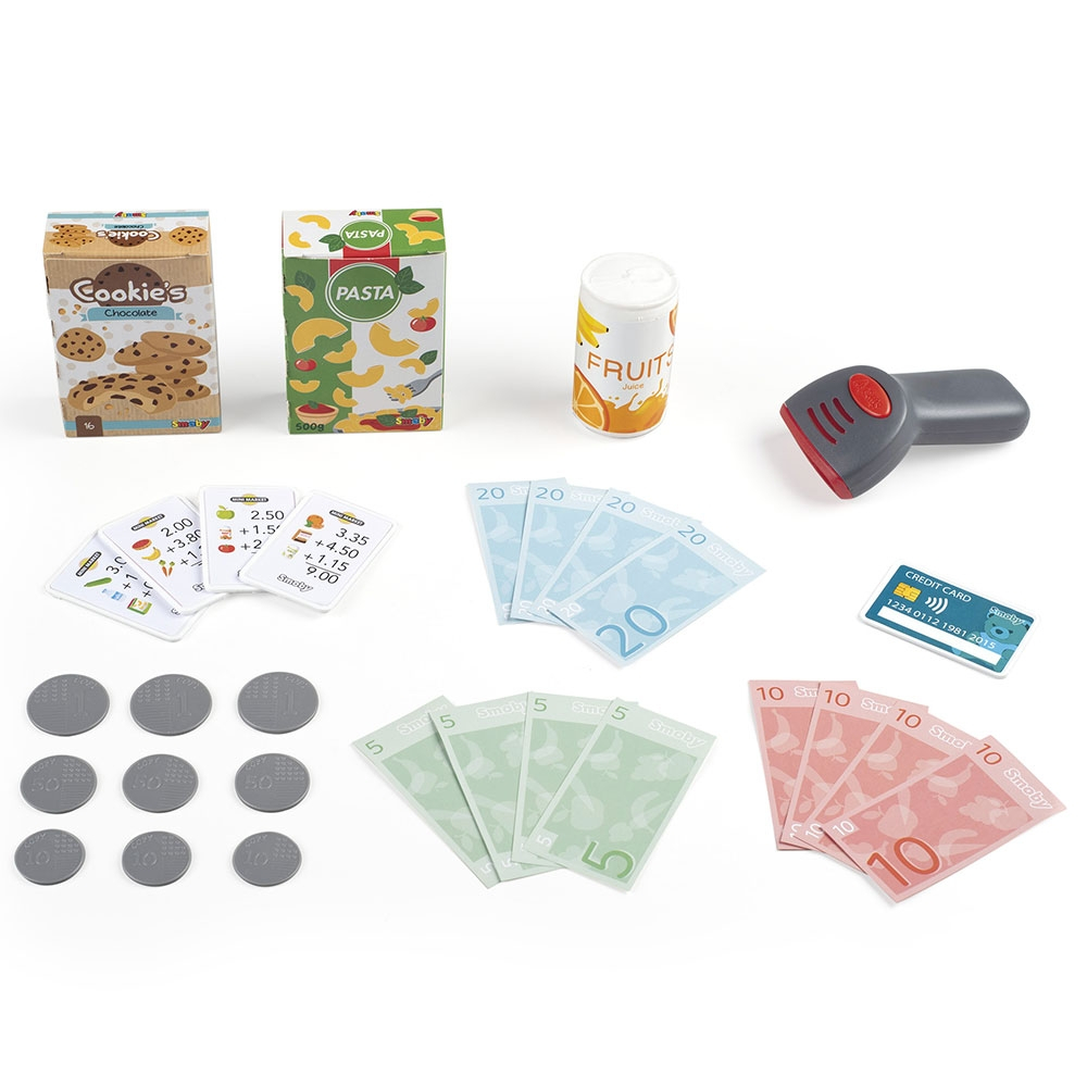 - Setul include 30 de accesorii printre care: casa de marcat cu calculator functional, scaner cu lumini si sunete, bautura, pachet de paste, pachet de fursecuri, card, chitante, monede si bancnote